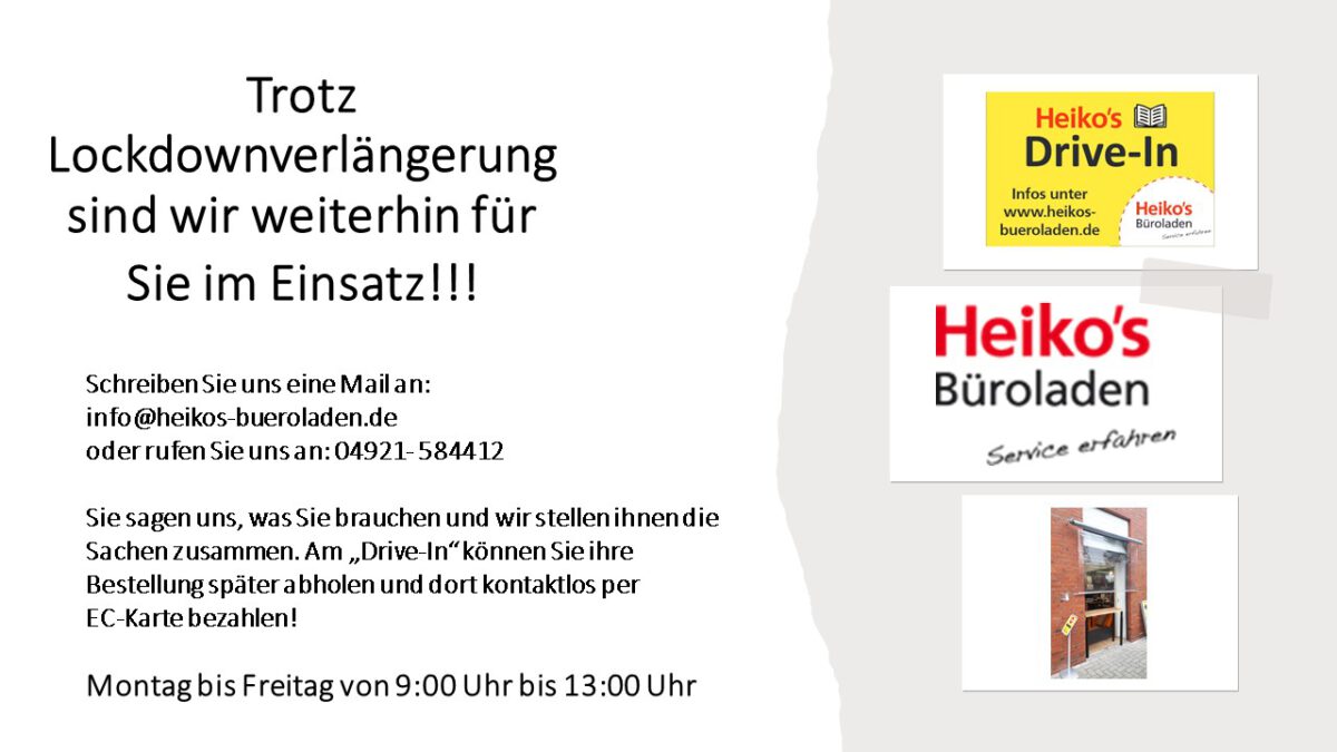 ÖffnungszeitenVon Heiko's Büroladen / 8. Januar 2021 Unser „Drive-In“ hat weiterhin von Mo.-Fr.: von 9- 13 Uhr geöffnet.